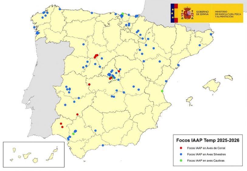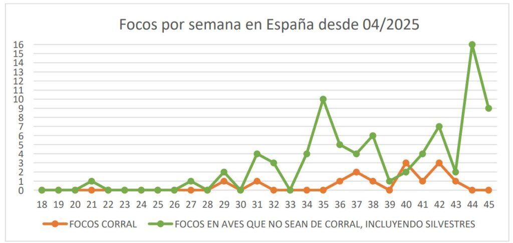 En territorio español, el virus ha mostrado un comportamiento expansivo. Desde julio se han confirmado 14 focos en aves de corral, afectando principalmente a Castilla y León (7 focos), seguida de Castilla-La Mancha, Andalucía, Extremadura y Madrid. Además, se han notificado casos en aves cautivas y de autoconsumo.