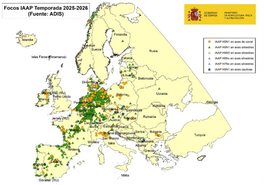 Madrid, 17 nov. 2025. El Ministerio de Agricultura, Pesca y Alimentación (MAPA) ha actualizado hoy la situación epidemiológica respecto a la Influenza Aviar de Alta Patogenicidad (IAAP) H5N1, revelando un escenario de alerta creciente tanto en España como en el resto de Europa. La combinación de un aumento significativo de casos en aves silvestres y la llegada de bajas temperaturas ha motivado un endurecimiento de las medidas de control a nivel nacional.