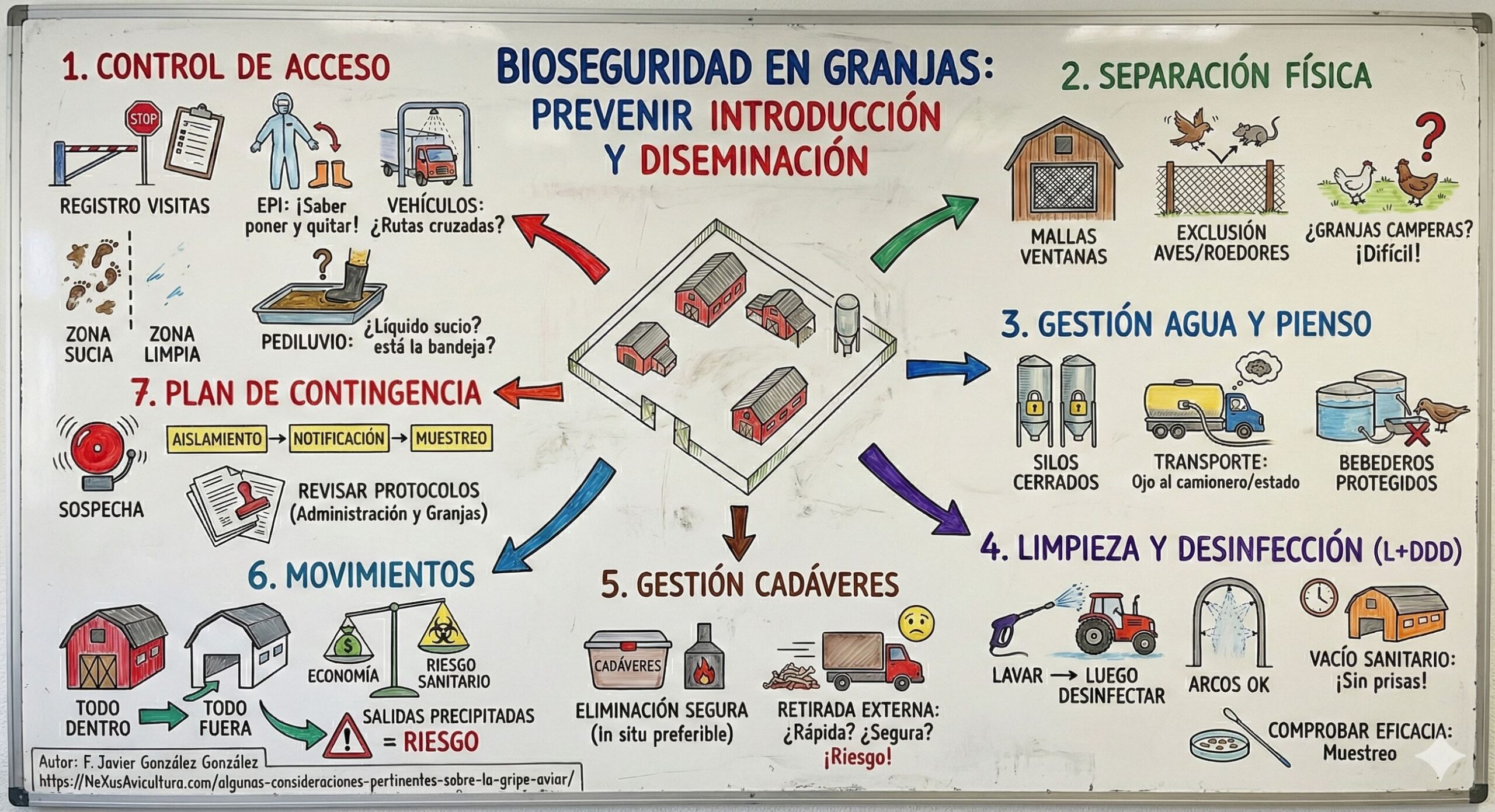 • Separación física: mallas en ventanas, exclusión de aves silvestres, control de roedores y otras especies.Parece evidente que estas prácticas hacen agua por todos lados cuando hablamos de granjas camperas o ecológicas, ambas con salida a parques. Ya es difícil hacerlo en naves cerradas donde es relativamente frecuente ver pájaros volando dentro, por no hablar de los roedores o de los gatos que algunos tienen para combatir ambas «plagas». Por supuesto que hay que tener planes, pero también hay que asegurarse de su eficacia para cambiarlos y adaptarlos según las necesidades.