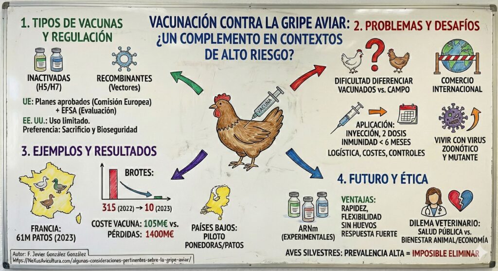 Actualmente, si no estoy mal informado, ya disponemos de vacunas inactivadas (subtipos H5/H7) y recombinantes (vectores). En la UE, su uso es posible bajo planes aprobados por la Comisión Europea y con evaluación de EFSA. En EEUU la vacunación en aves comerciales sigue muy limitada, con preferencia por sacrificio y bioseguridad por implicaciones comerciales y de vigilancia que a nadie se le escapan.