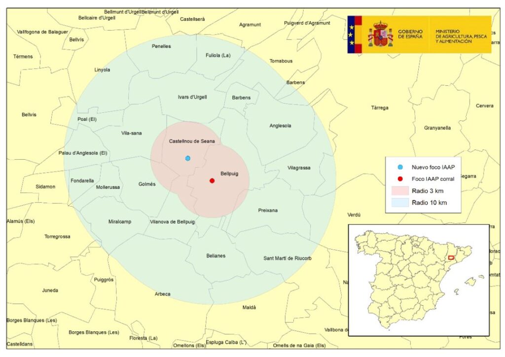 Lleida, viernes 9 dic. 2026, 18:00 horas. El Govern y la conselleria de Agricultura de la Generalitat de Catalunya han confirmado la detección de un nuevo foco de influenza aviaria en una explotación de Castellnou de Seana (Pla d’Urgell), situada a tan solo 3 kilómetros del foco inicial de Bellpuig. Este caso, anunciado el 9 de enero de 2026, es un brote secundario al primer caso confirmado durante el pasado periodo de Nochebuena que afectó a 235.000 gallinas ponedoras en Bellpuig. Su detección se ha visto acelerada gracias a las medidas de control aplicadas realizadas a todas las granjas ubicadas en un radio de 10 km del foco del 24 diciembre 2026 y que hizo que 2025 cerrase con un total de casi 3 Millones de aves de granja sacrificadas en España en los 15 brotes de 2025.