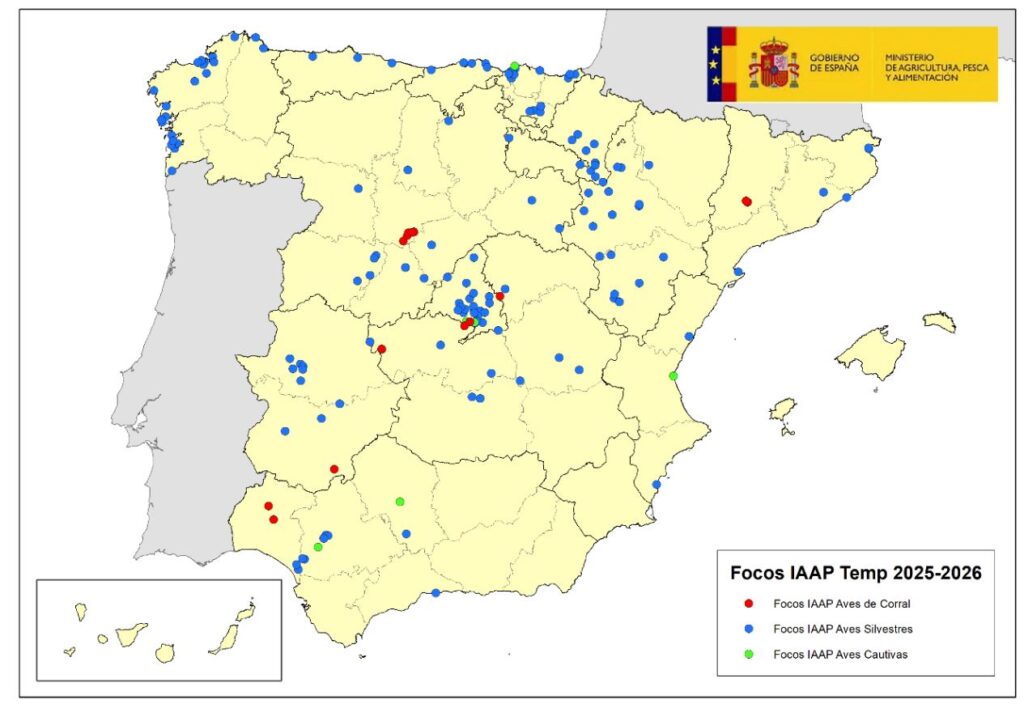 -. 1er brote de 2026 (9 enero, Lleida) : Primer brote de Influenza Aviar de 2026 en España. Es secundario al del 24 diciembre de Bellpuig y se ha producido en granja 9.000 reproductoras.