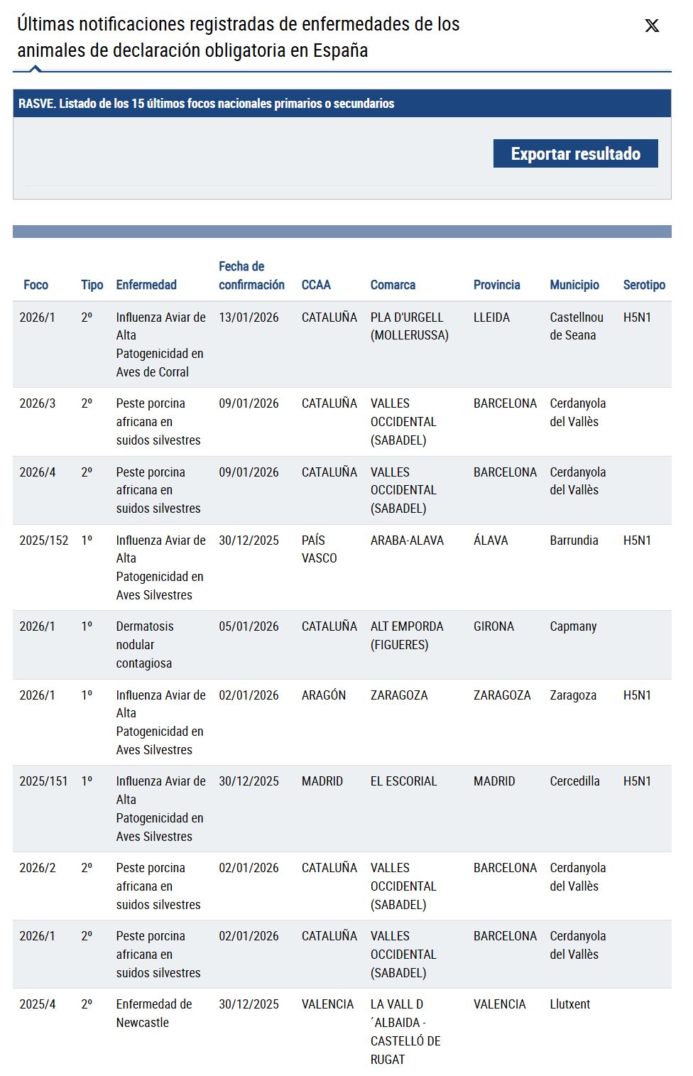 En lo que respecta la Administración Central, el 13 enero 2026 ya han actualizado el listado oficial RASVE de Últimas notificaciones registradas de enfermedades de los animales de declaración obligatoria en España , por lo que este último brote ya ha sido confirmado oficialmente por parte del Ministerio de Agricultura.