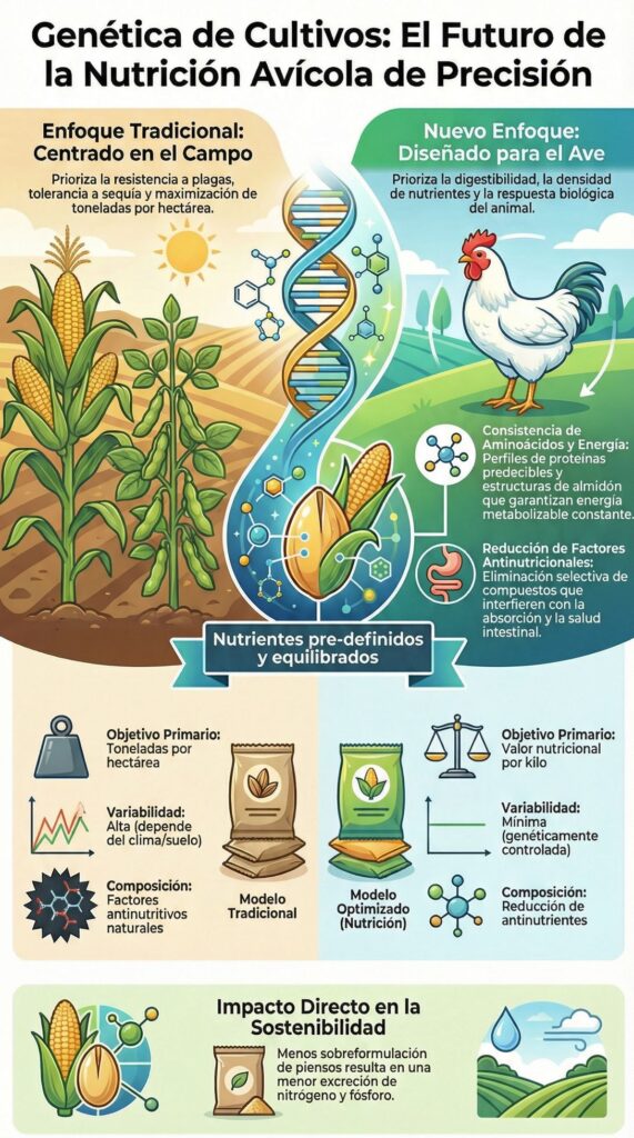 Los genetistas vegetales ya manipulan muchas de estas características para los mercados de alimentos humanos. La soja con alto contenido oleico, el maíz ceroso y los granos bajos en fitatos demuestran que es posible una mejora selectiva basada en unos caracteres de su composición. Ampliar este enfoque a la nutrición avícola es un paso lógico a continuación.