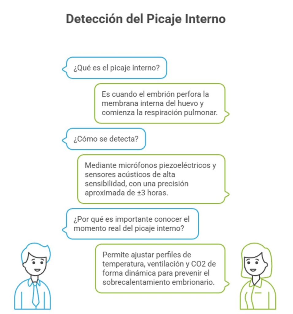 Conocer el momento real, biológico, no teórico, del picaje interno permite ajustar perfiles de temperatura, ventilación y CO2 de forma dinámica. Si el picaje ocurre antes de lo esperado, una bajada oportuna de temperatura puede prevenir el sobrecalentamiento embrionario, un problema frecuente y costoso que muchas veces solo se detecta cuando los pollitos ya muestran signos de jadeo y estrés.