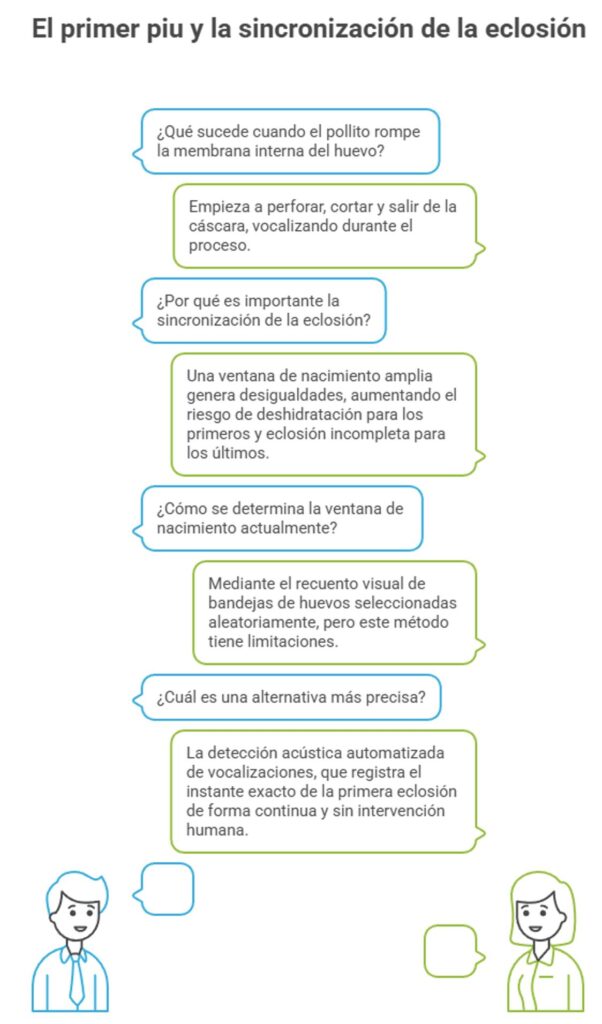 Desde los clics embrionarios hasta los primeros “piu”, las vocalizaciones ofrecen información en tiempo real sobre el estado fisiológico del embrión y del pollito recién nacido. Aprender a escuchar en la sala de nacimientos, y en la sala de expediciones, no solo mejora la sincronización de la eclosión y la calidad del pollito, sino que abre la puerta a una incubación más precisa, adaptable y alineada con la biología natural del ave.