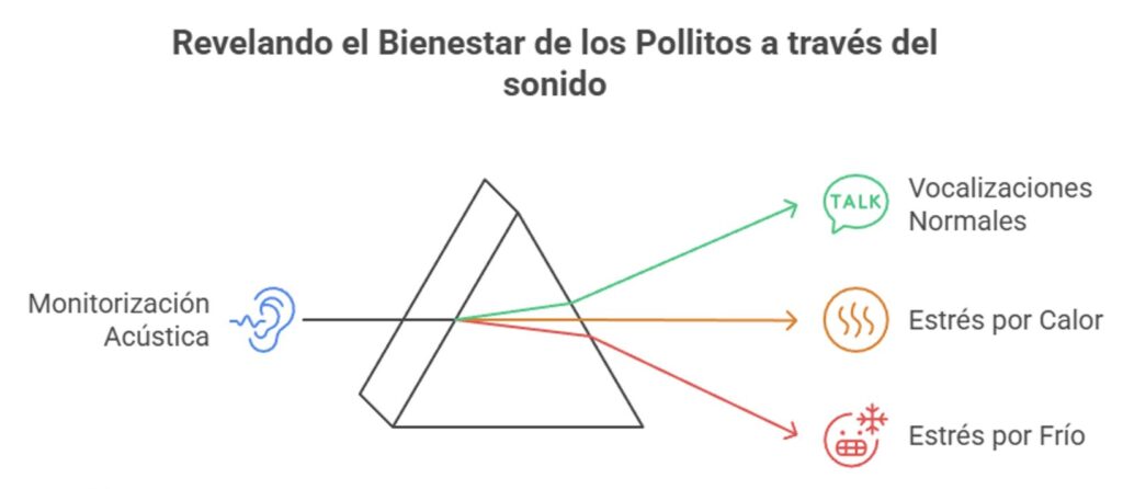 En condiciones óptimas, los pollitos emiten un “piar” rítmico asociado a actividad normal. Sin embargo, una densidad excesiva y el consiguiente aumento de temperatura conducen al jadeo, acompañado de una marcada reducción de las vocalizaciones, mientras que zonas frías generadas por mala distribución del aire producen llamadas agudas de angustia.