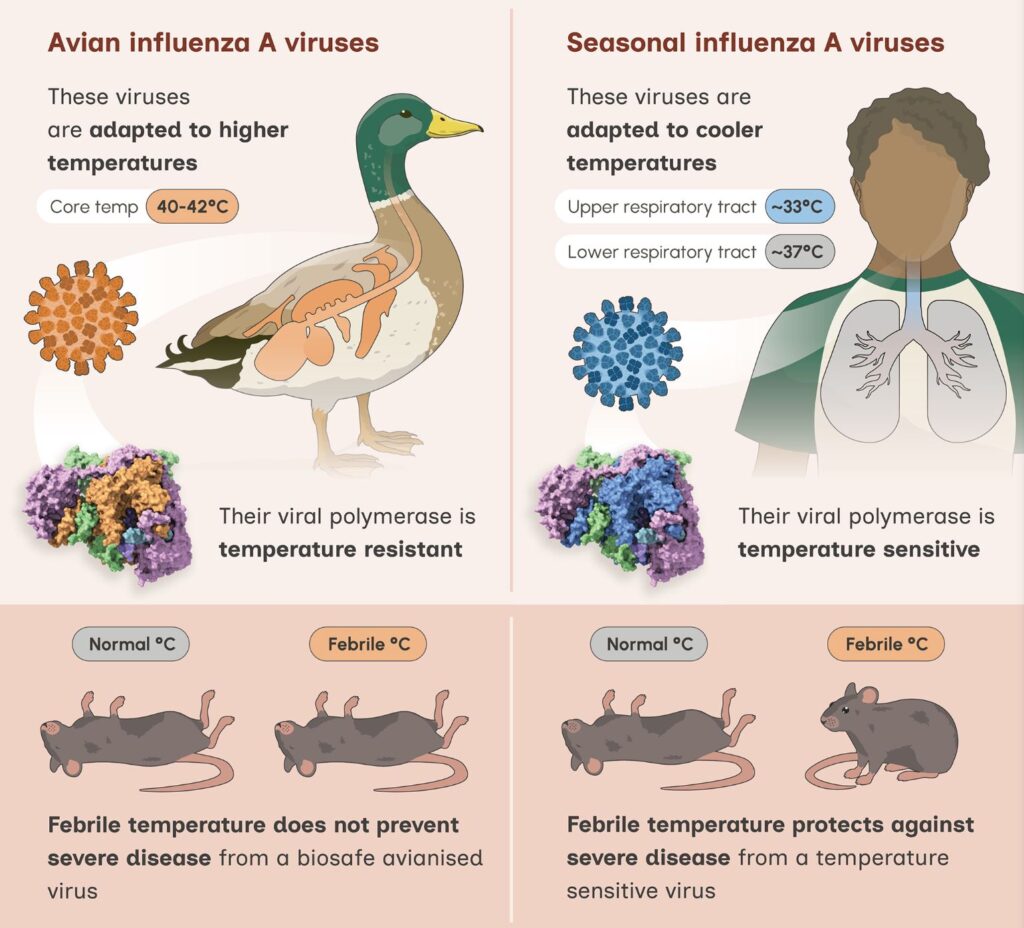 -. Turnbull, ML et al. Avian-origin influenza A viruses tolerate elevated pyrexic temperatures in mammals. Science; 27 Nov 2025; DOI: 10.1126/science.adq4691