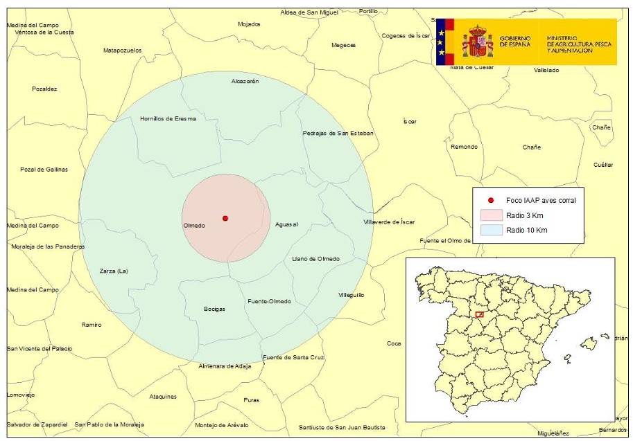 Las autoridades veterinarias de la Junta de Castilla y León han notificado hoy, viernes 19 de septiembre, un foco de Influenza aviar de alta patogenicidad (IAAP), subtipo H5N1, en una explotación de gallinas ponedoras con un censo aproximado de 760.000 aves, localizada en el municipio de Olmedo, comarca de Olmedo, en la provincia de Valladolid. Ver Mapa 1.
