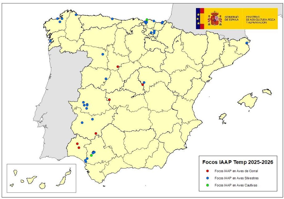Se trata del sexto foco de IAAP H5N1 notificado en España en granjas avícolas en 2025, tras los focos detectados en Badajoz (1), Huelva (2), Toledo (1) y Guadalajara (1). No se ha detectado ninguna relación epidemiológica entre los distintos focos, considerándose que la vía más probable de introducción del virus en la granja ha sido por medio de contacto directo o indirecto con aves silvestres, dado que durante las últimas semanas se han detectado varios casos de IAAP H5N1 en aves silvestres en distintas partes de la península.