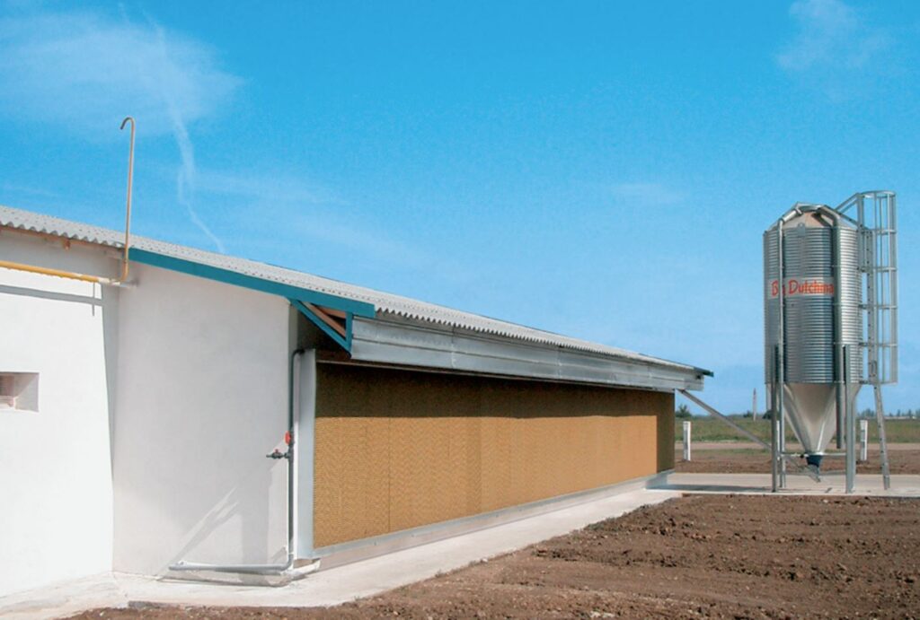 Los sistemas convencionales de refrigeración evaporativa (RE) ( popularmente conocidos como «Coolings» o «paneles evaporativos») reducen eficazmente la temperatura de las naves, pero dependen mucho del uso de agua y a menudo aumentan la humedad relativa, lo que puede afectar la capacidad de las aves para disipar su calor mediante la respiración.