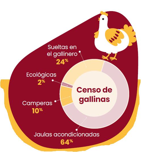 | Censo de ponedoras en Sistemas Libres de Jaulas | 16,8 M de ponedoras (el 36% ) ya están en sistemas sin jaulas pero, aunque disminuyendo año tras año, las jaulas enriquecidas es donde sigue estando la mayoría del censo , 31 M de ponedoras | En lo referente a la PRODUCCIÓN , en valores absolutos, de los 47,8 M de gallinas ponedoras en España, 31 M (el 64%) aún se mantienen en naves con jaulas enriquecidas. |