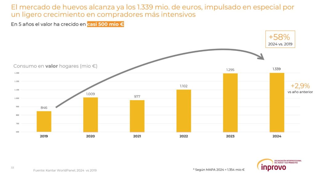 En cuanto al gasto, los hogares españoles destinaron 1.354 millones de euros a la compra de huevos en 2024, con un gasto medio per cápita de 29 euros anuales. A pesar de un aumento del 14% en el precio medio del huevo en marzo de 2025 respecto al año anterior (3,68 euros/kg frente a 3,23 euros/kg), el consumo ha continuado creciendo, lo que la directora de Inprovo, Mari Luz Santos, ha calificado de «poco significativo» debido al «bajo valor» inherente del producto y su rol como una fuente de proteína muy asequible.