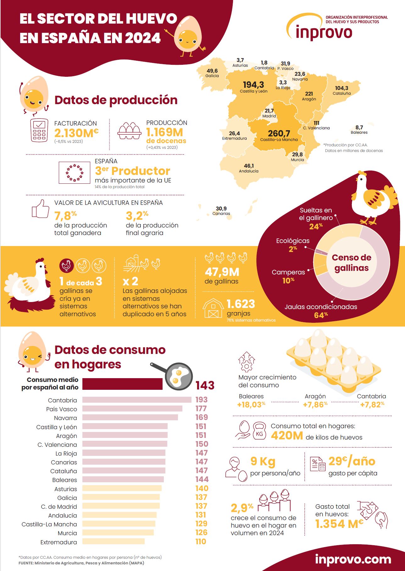 | Producción total | 1.169 millones de docenas | Aumento del 0,43% respecto a 2023. España es el 3er productor de la UE (14% del total). |