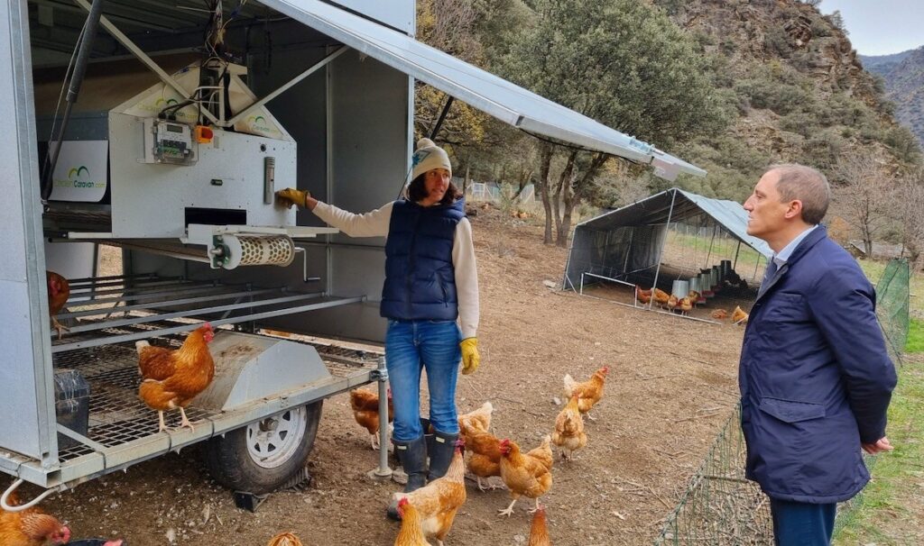 La avicultura catalana no solo alimenta a la población, sino que permite el emprendimiento rural con pequeñas iniciativas avícolas, como esta de Nuria Padros, avicultora y propietaria de la granja ecologica La Bana, en Tirvia, Lleida. En la foto, Nuria con un modelo de la caravana australiana CHICKENCARAVAN.COM
