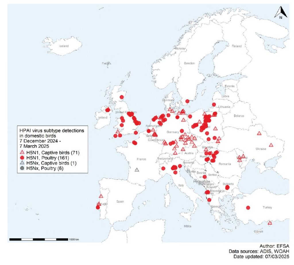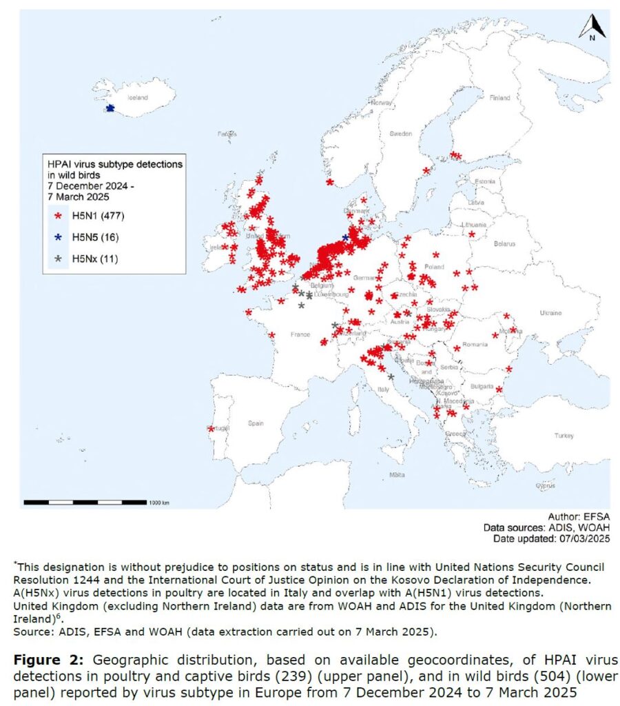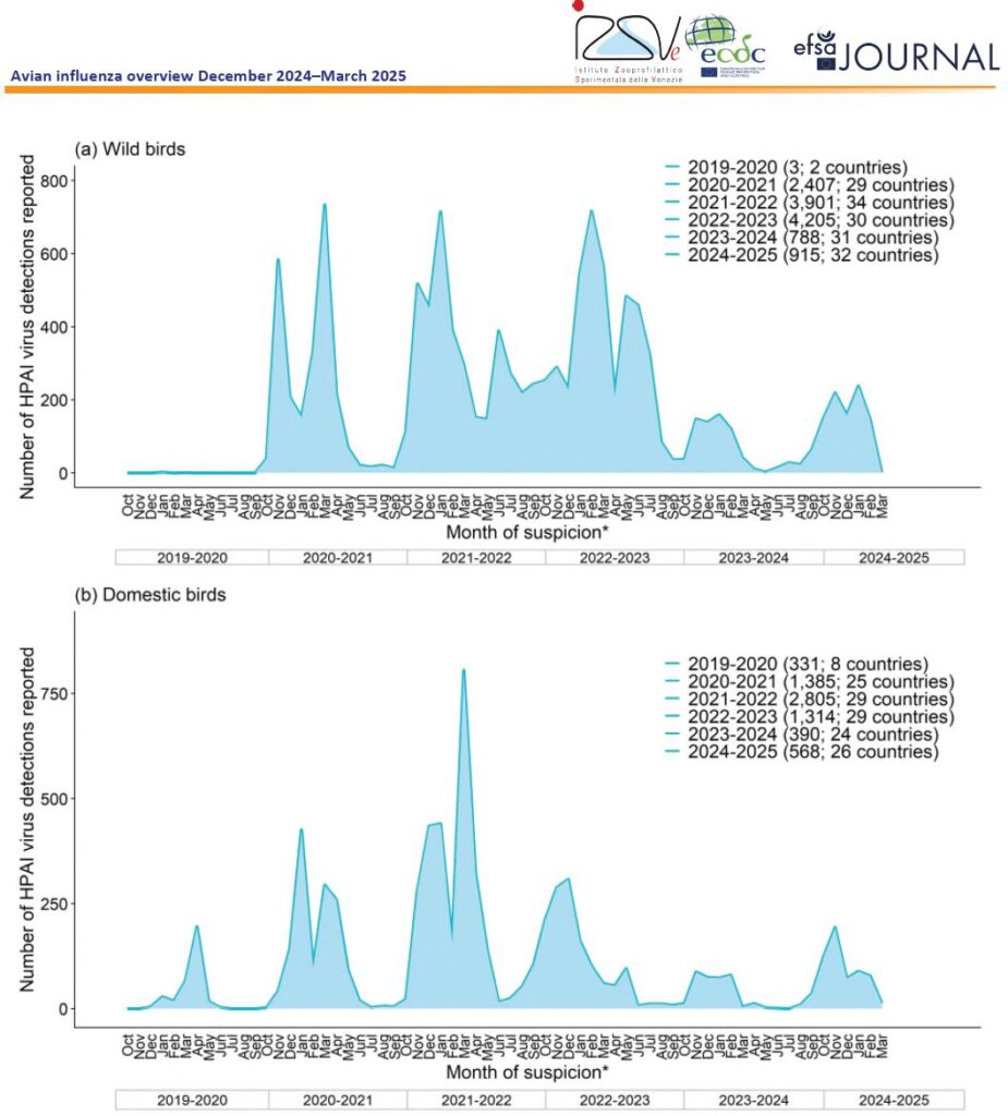 -. EFSA Report: Avian influenza overview December 2024–March 2025. Published 15 april 2025 (73 pages)