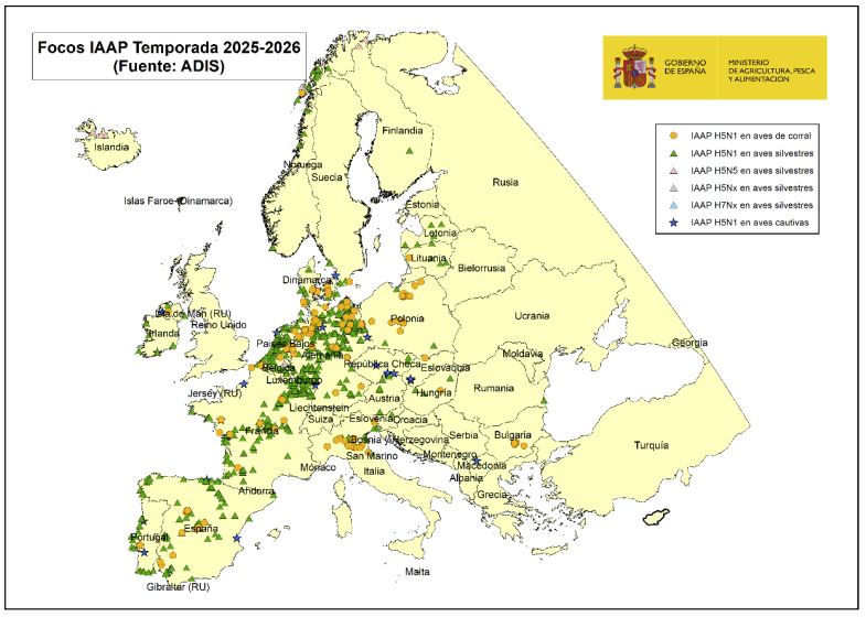 Madrid, (05/11/2025) . El Ministerio de Agricultura de España ha emitido emite una nota el 5 de noviembre de 2025 ante el aumento de focos de Influenza Aviar de Alta Patogenicidad (IAAP) en Europa, tanto en aves de corral como silvestres. En España se han detectado 14 focos en aves de corral y 68 en aves silvestres. Debido al empeoramiento de la situación y la previsión de bajada de temperaturas, el riesgo para España ha aumentado. Por ello, a partir del 10 de noviembre de 2025, se activan medidas preventivas de la Orden APA/2442/2006. Estas medidas incluyen , entre otras, la prohibición de criar aves de corral al aire libre en aquellas poblaciones incluidas en el ANEXO II y III de dicha orden y el endurecimiento de las excepciones.