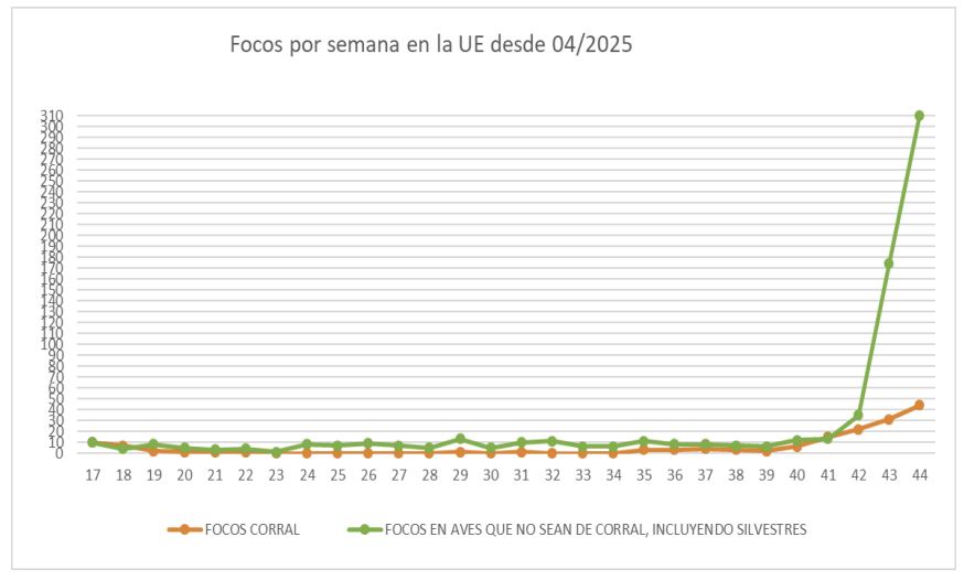 Tabla 1: Evolución semanal en la UE de focos LAAP aves de corral y no de corral (incluidas silvestres) en la actual temporada 2025-26 (hasta la semana 44 – del 27 oct al dom. 2 nov – de 2025)