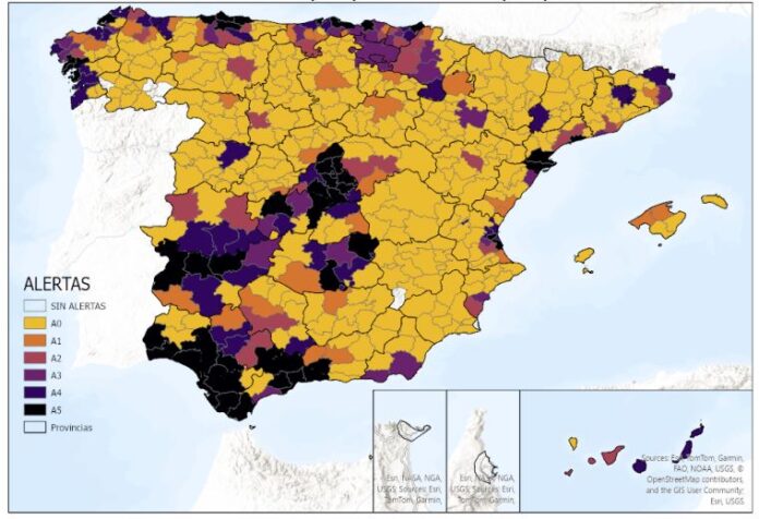 Este modelo ha reafirmado la tendencia observada en semanas previas y dando como resultado en la última semana de octubre 2025, un aumento de riesgo significativo evidenciado por un aumento en el número de municipios en nivel de riesgo alto y muy alto (comarcas más oscuras en el mapa 2), municipios que en muchos casos están además incluidos en zonas de especial riesgo y en la zonas de especial vigilancia recogidos en los anexos II y III de la Orden APA/2442/2006.