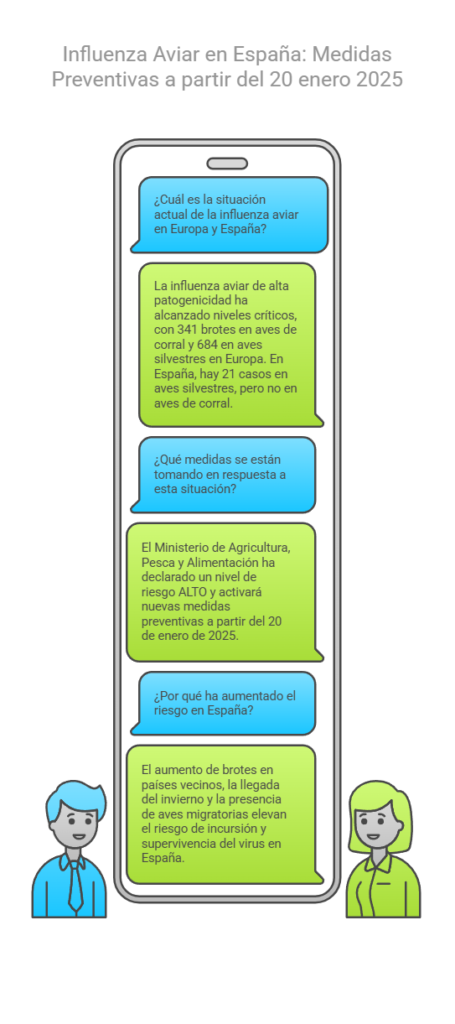 En España, aunque no ha habido ni un solo caso en aves de corral, si han habido 21 casos detectados en aves silvestres; esto, junto al caso en enero de gripe aviar en una granja de ponedoras en Portugal, y los dos casos de fin de diciembre en Francia, ha llevado al Ministerio de Agricultura, Pesca y Alimentación (MAPA) a declarar un nivel de riesgo ALTO, activando nuevas medidas preventivas a partir del próximo lunes 20 de enero de 2025.