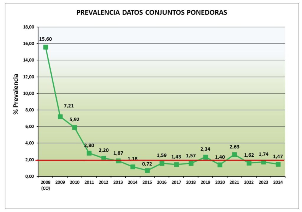 La evolución de la prevalencia frente a salmonelas objeto de control en manadas de aves ponedoras Gallus gallus ha sido la presentada en el gráfico al pie de este artículo , siendo S. Enteritidis el serotipo más prevalente entre los serotipos objeto de control en los PNCS (Planes Nacionales de Control de Salmonella).