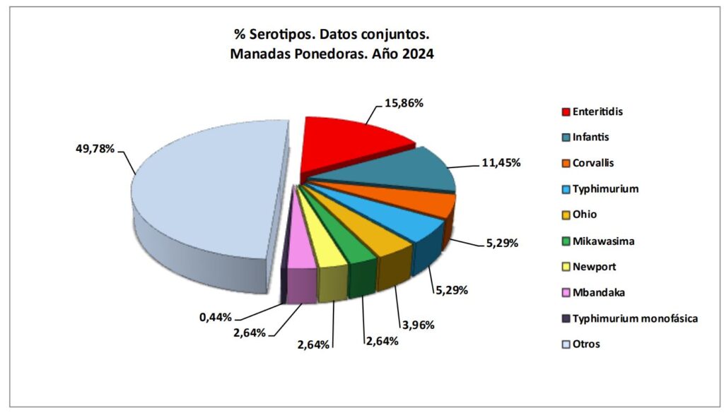 En 2024, el serotipo más frecuente entre los detectados fue «Otros» (49,78 %), seguido de S. Enteritidis (15,86 %), S. Infantis (11,45 %) y S. Corvallis (5,29 %). S. Typhimurium y su variante monofásica representaron en conjunto alrededor del 3 %.