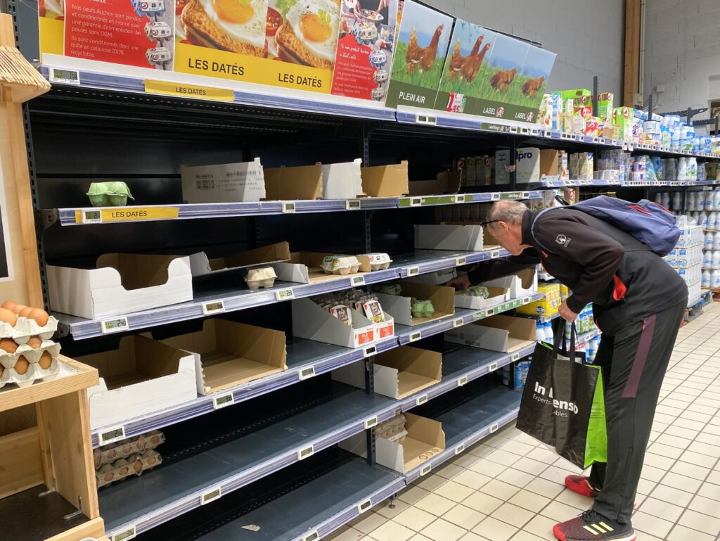 La «penuria» o los insuficientes huevos en los supermercados franceses: un desajuste entre el consumo récord , las trabas burocraticas y judiciales, los fallos de la logística y la imparable demanda.
