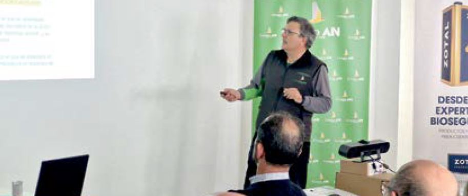 A continuación, Enrique Ruiz Montero, R&D Manager de Laboratorios Zotal, centró su exposición en las claves en la bioseguridad del agua. Tras explicar la importancia que tiene en la bioseguridad el agua de bebida, que es el principal nutriente en avicultura, enumeró los principales parámetros de calidad del agua, tanto fisicoquímicos como microbiológicos. Seguidamente, analizó los desafíos físicos y biológicos de los desinfectantes en el circuito del agua y utilizó el ejemplo concreto del producto Virkon H2O: un desinfectante y acidificante innovador comercializado por Zotal, del que Ruiz Montero destacó sus ventajas con respecto a otros productos.