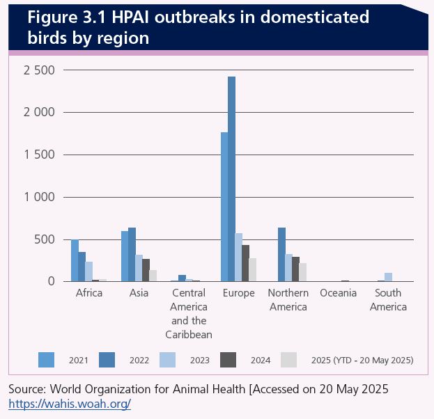 La IAAP es una enfermedad viral que afecta a las poblaciones de aves domésticas y silvestres, y su propagación transfronteriza se ha vuelto más persistente y durante todo el año desde 2020. Aunque el sector del pollo de engorde se ha visto menos afectado debido a sus ciclos de producción más cortos y sistemas de alojamiento cerrados, el sector de ponedoras ha experimentado interrupciones más pronunciadas y prolongadas. La seguridad alimentaria no es la principal preocupación, ya que el virus se inactiva a temperaturas de cocción estándar. Sin embargo, su impacto económico es significativo, interrumpiendo las cadenas de suministro, erosionando los márgenes agrícolas y desencadenando restricciones comerciales internacionales.