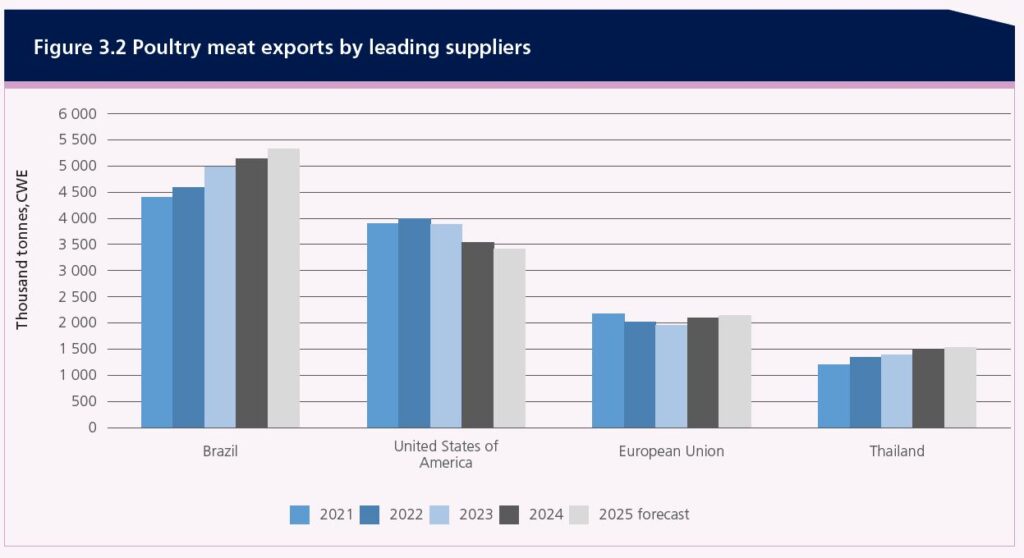 No obstante, el crecimiento de la producción podría verse limitado en algunas regiones por brotes persistentes de enfermedades animales (notablemente IAAP y enfermedad de Newcastle) y la escasez de existencias reproductoras. Se anticipan aumentos notables en la producción en Brasil, China, la Unión Europea y Estados Unidos, así como en India, Indonesia, México, Pakistán, la Federación Rusa y Turquía, impulsados por una demanda interna y externa sostenida.