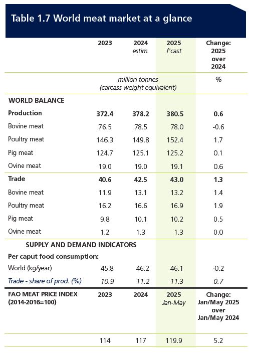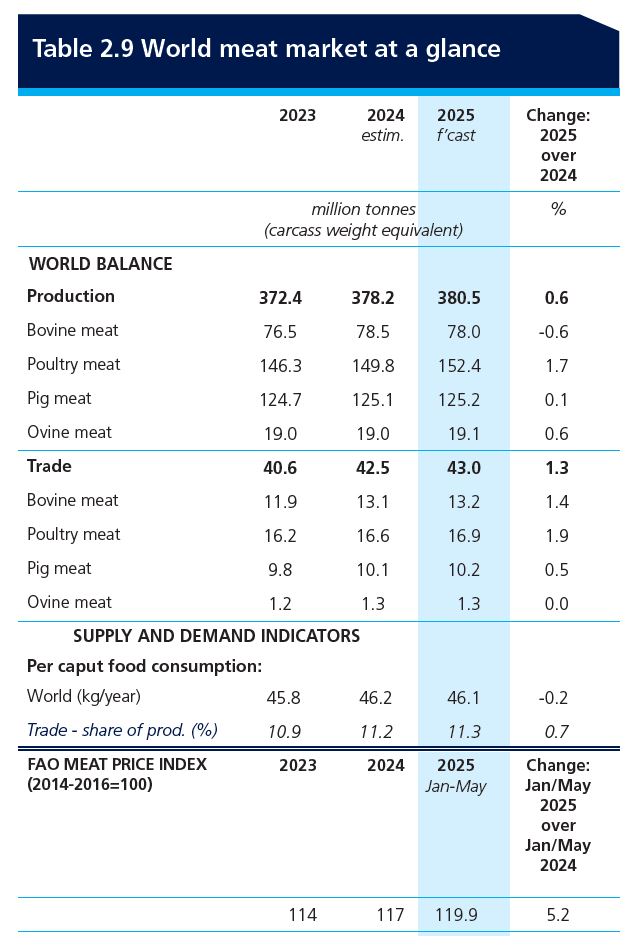 Si analizamos a fondo la parte de este informe bianual (se publica cada año en junio y en noviembre) centrada en la evaluación de mercados, vemos que el «FAO Food Outlook» de junio de 2025 proporciona un análisis detallado sobre la situación y las perspectivas de la carne y los productos cárnicos a nivel global.