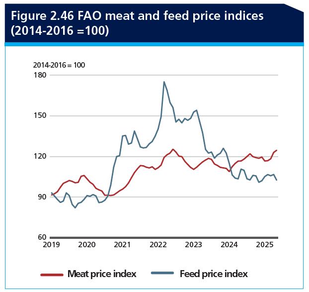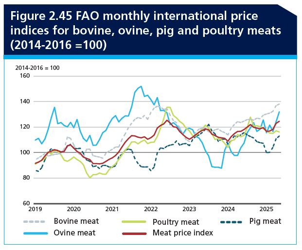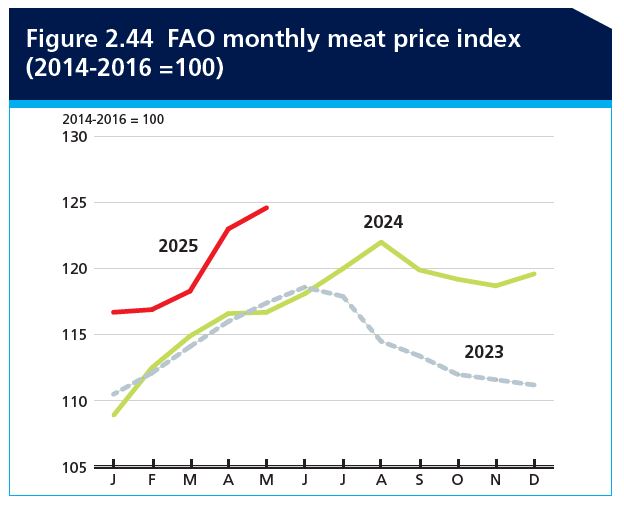 El Índice de Precios de la Carne de la FAO (IPMC) ha mostrado una tendencia al alza durante los primeros cinco meses de 2025, reflejando la reducción de la oferta exportable en varios países productores importantes, combinada con una demanda global sostenida. La incertidumbre del mercado, impulsada por brotes generalizados de enfermedades animales y tensiones en la política comercial, ha contribuido al aumento de los precios. Además, el acaparamiento anticipatorio por parte de algunos países importadores, por temor a posibles interrupciones comerciales, ha ejercido una presión al alza adicional sobre los precios internacionales de la carne. En mayo de 2025, el IPMC promedió 124,6 puntos, un 6,8 por ciento más que en enero, y un 6,8 por ciento más que el valor correspondiente del año anterior.