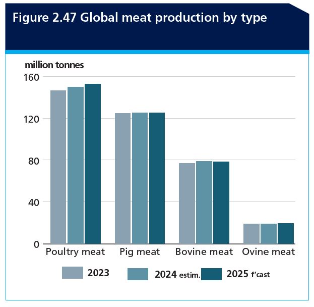 Se pronostica que la producción mundial de carne aumentará modestamente en 2025, un 0,6 por ciento interanual, para alcanzar los 380 millones de toneladas (equivalente en peso de canal). Este crecimiento se deberá principalmente a la expansión esperada de la producción de carne de ave, mientras que la producción de carne de cerdo y ovina solo registrará aumentos marginales. En contraste, se prevé una disminución en la producción de carne de bovino, lo que compensará parcialmente el crecimiento general.
