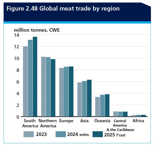 Se pronostica que el comercio mundial de carne crecerá un 1,3 por ciento en 2025, alcanzando los 43 millones de toneladas, lo que representa una desaceleración significativa en comparación con el crecimiento estimado del 4,7 por ciento en 2024. El modesto crecimiento previsto se basa en las expectativas de una oferta mundial más ajustada y una demanda de importación firme. Sin embargo, el crecimiento se verá probablemente afectado por las tensiones geopolíticas, la implementación de medidas restrictivas al comercio y la continua propagación de enfermedades animales, que podrían seguir perturbando los flujos comerciales. La expansión comercial proyectada será impulsada principalmente por mayores envíos de carne de ave, respaldados por su asequibilidad en relación con otras carnes.