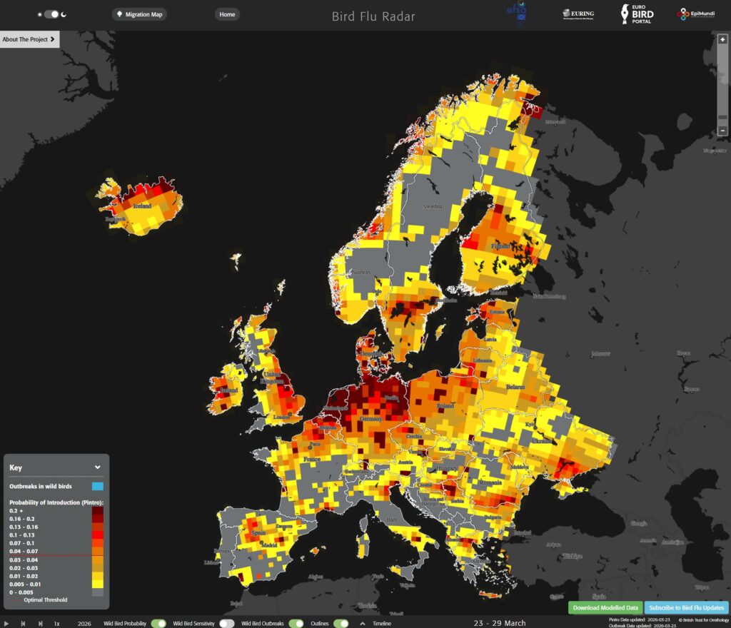 Casos detectados de Influenza Aviar en aves silvestres y riesgo detallado por regiones y países. Esta imagen es una captura de pantalla de la situación el viernes 27 de marzo 2026, para ver el riesgo actualizado en tiempo real ir a BIRD FLU RADAR
