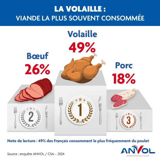 Las aves de corral forman parte de los hábitos de consumo de los franceses. De hecho, el 49 % afirma que es la carne que consumen con más frecuencia. Esta proporción sitúa a las aves de corral por delante de la carne de vacuno, citada por el 26 % de los franceses, o la de cerdo, que el 18 % de los franceses dice consumir con más frecuencia.