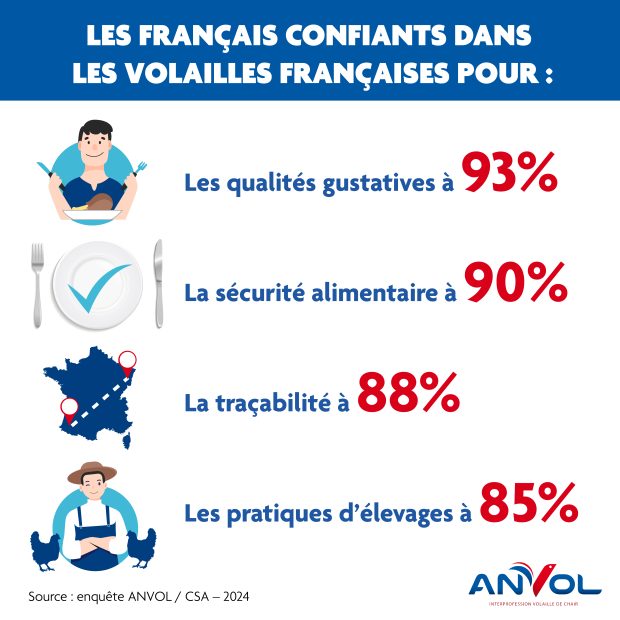 Los franceses confían ampliamente en las aves de corral francesas. El 93 % expresa su confianza en sus cualidades gustativas y el 90 % en su capacidad para garantizar la seguridad alimentaria. El 88 % confía en su trazabilidad y el 85 % en las prácticas de cría de los profesionales franceses.