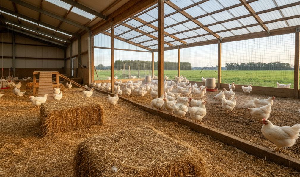 Una veranda cubierta puede mejorar las condiciones de vida de los pollos de engorde al proporcionar acceso a diferentes entornos y áreas con distinta disponibilidad de espacio.