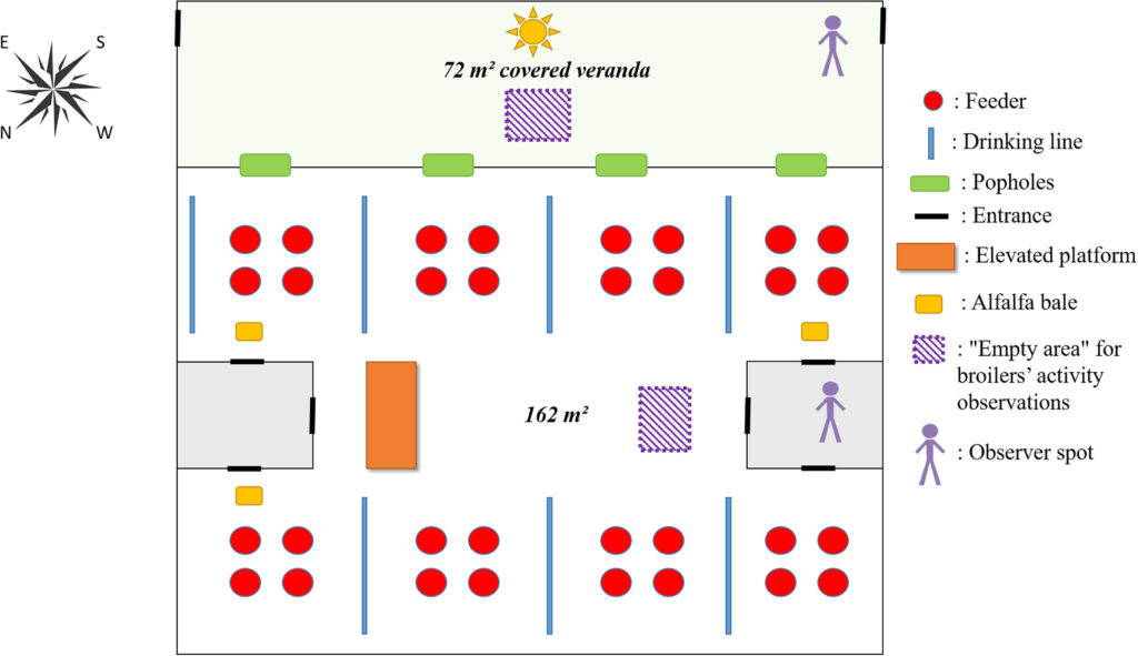 Tres de las salas (grupo CV) tenían cuatro aberturas («popholes») que permitían el acceso 24 horas al día a una veranda cubierta de 72 m² desde los 22 días de edad. Las otras tres salas (grupo C) no tenían acceso a verandas, manteniendo las aberturas cerradas. Las verandas cubiertas tenían suelo de hormigón con pellets de paja, estaban rodeadas de malla de alambre y protegidas con un techo con film antigoteo y mallas cortavientos. Las temperaturas exteriores registradas durante el período de acceso a las verandas oscilaron entre 1.8°C y 18.6°C.