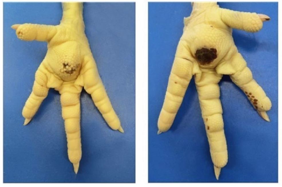 - Salud de las patas y puntuación de cojera: En el día 36, se evaluaron la puntuación de cojera, la presencia y la gravedad de dermatitis de las almohadillas plantares y quemaduras en los corvejones en 150 aves seleccionadas por grupo. Se utilizó una escala de 0 a 2 puntos para cada criterio (Tabla 1).