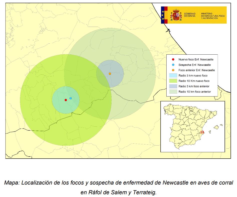 Valencia, 9 de abril 2026 – Las autoridades veterinarias de la Comunidad Valenciana han notificado un nuevo foco de enfermedad de Newcastle en una granja de broilers localizada en el municipio de Ráfol de Salem, en la comarca de Vall D’Albaida (provincia de Valencia), situado a algo más de 10 km de un foco anterior notificado en el municipio de Terrateig el pasado 9 de marzo. El número total de focos de enfermedad de Newcastle notificados en España en aves de corral en la presente temporada asciende a 7, detectados todos en la provincia de Valencia.