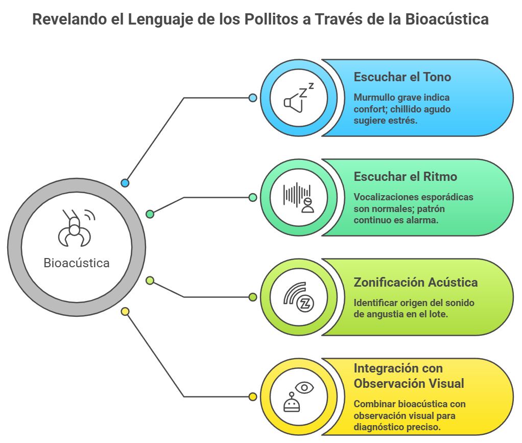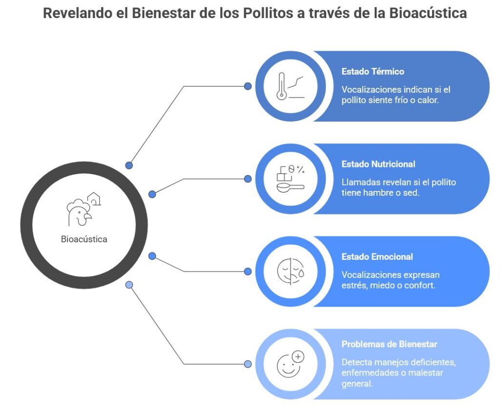 En este contexto, la bioacústica emerge como una herramienta complementaria de gran utilidad. Las vocalizaciones del pollito contienen información biológica precisa sobre su estado térmico, nutricional, emocional entre otros. Las llamadas de estrés o angustia son emitidas por los pollitos cuando algo va mal y permiten detectar problemas de bienestar, manejos deficientes, enfermedades, hambre o sed, homeotermia, etc.