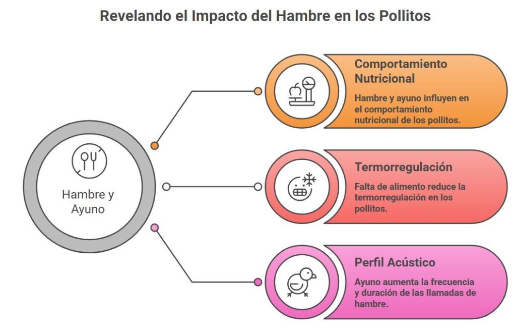 El ayuno post-eclosión, ya sea por retrasos logísticos o por dificultades de acceso al alimento en granja, tiene efectos directos sobre la vocalización. Las llamadas asociadas al hambre suelen presentar frecuencias fundamentales más altas, mayor duración individual y mayor repetitividad.
