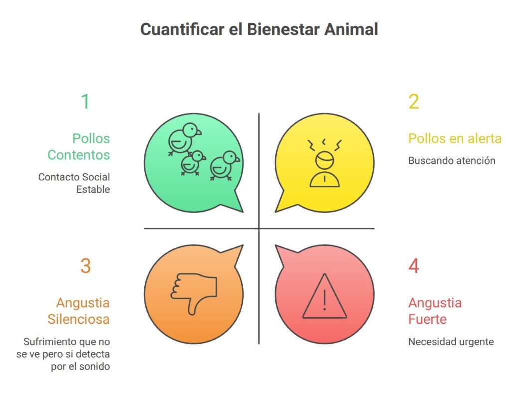 Tradicionalmente el bienestar animal se ha cuantificado de forma manual y cualitativa por falta de métodos cuantitativos fáciles de implementar. La bioacústica ofrece una vía objetiva y cuantitativa para evaluar el bienestar animal analizando de forma sistemática las vocalizaciones que producen las aves. Medir parámetros como frecuencia, numero de vocalizaciones, intensidad, ritmo, entropía, entre otros se correlacionan con estados fisiológicos y emocionales del animal permitiendo cuantificar de forma automática el bienestar de los animales. Por ejemplo, con la frecuencia y numero de vocalizaciones: