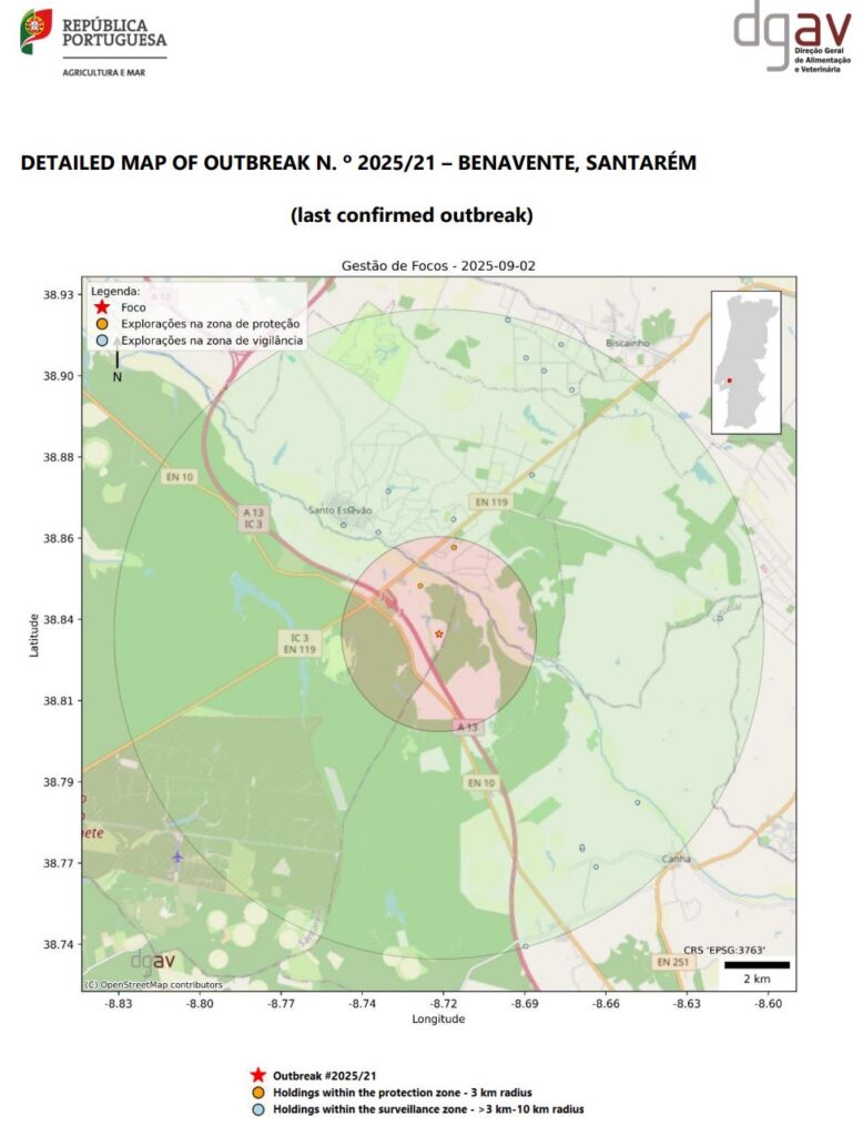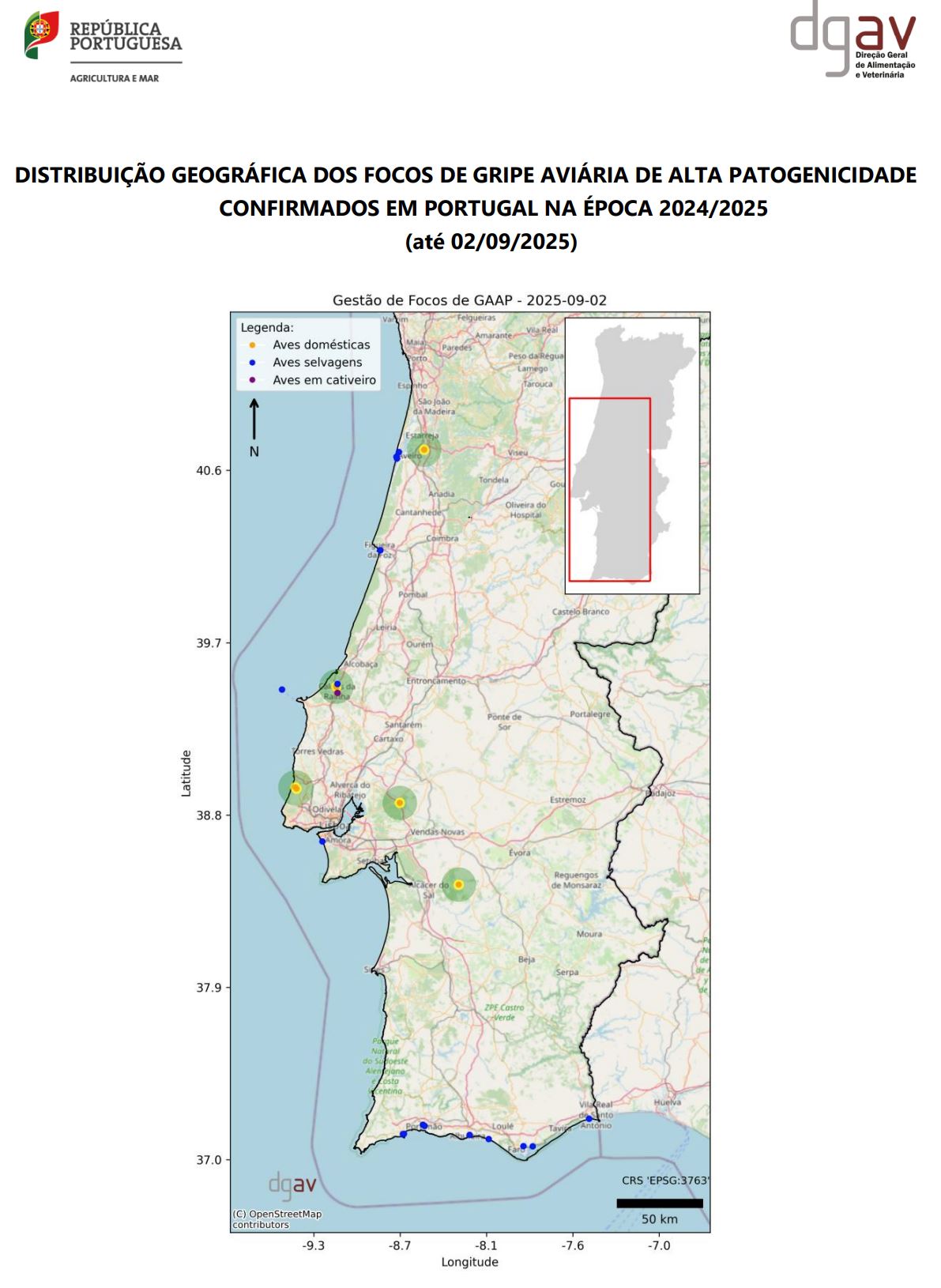 Portugal no había registrado H5N1 HPAI en su sector avícola desde enero 2025, si bien el virus nunca ha marchado pues hasta el 2 septiembre 2025 el país luso acumula casi una veintena de casos confirmados localizados en aves silvestres según informa la Direçao Geral de Alimentaçao e Veterinária de Portugal.