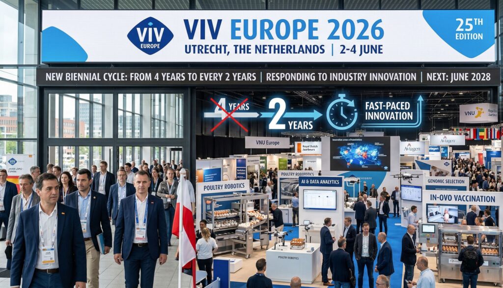 El anuncio llegó en enero y pasó casi desapercibido en los calendarios de muchos profesionales del sector: VIV Europe cambia de ciclo. A partir de 2026, la feria más importante del mundo en la cadena de valor avícola —del pienso al alimento procesado— dejará de celebrarse cada cuatro años para hacerlo cada dos. La próxima cita después de Utrecht 2026 ya tiene fecha: junio de 2028.